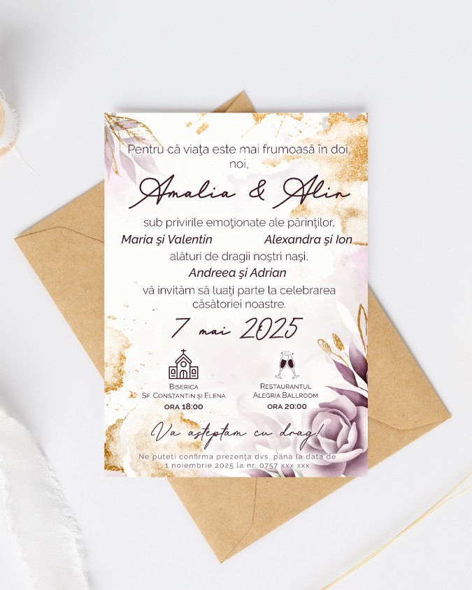 Invitatia este printata pe carton de 250 gr/mp si are dimensiunea aproximativ 13×18 cm. Plicul este optional.
