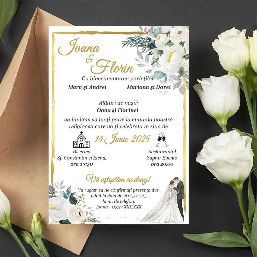 Invitatia este printata pe carton de 250 gr/mp si are dimensiunea aproximativ 13×18 cm.